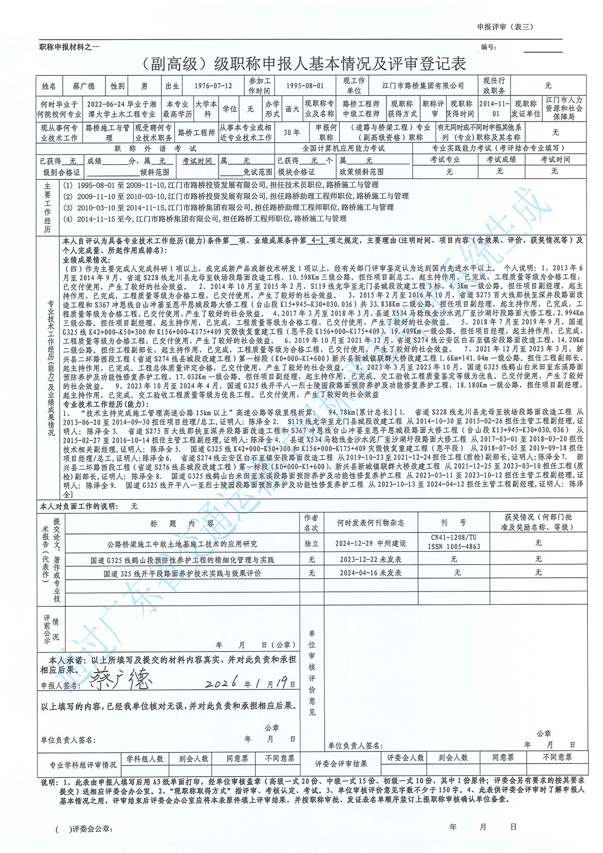 根据相关文件要求 ,现将蔡广德同志的专业技术资格申报情况予以公示。公示期间,如对其申报相关资格的资料有任何异议,可通过来信、来电、来访等形式向我们反映。公示时间 :2026.1.19至2026.1.23。